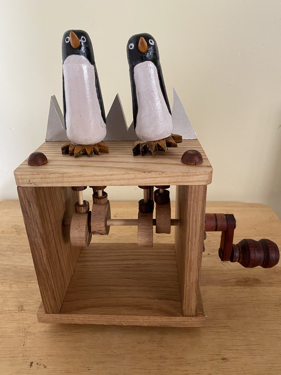 The Waddling penguins. This fun Automaton was a commision that I have just completed for a customer. All he asked was for 2 penguins walking. I made a few sketches and a couple of prototypes and after much sawdust, shavings and wood for the fire, this is waht I came up with. Two waddling penguins with some icebergs to enhance the scene. Oak,basswood and other hardwoods were used to create this interesting unique automaton...take a look.